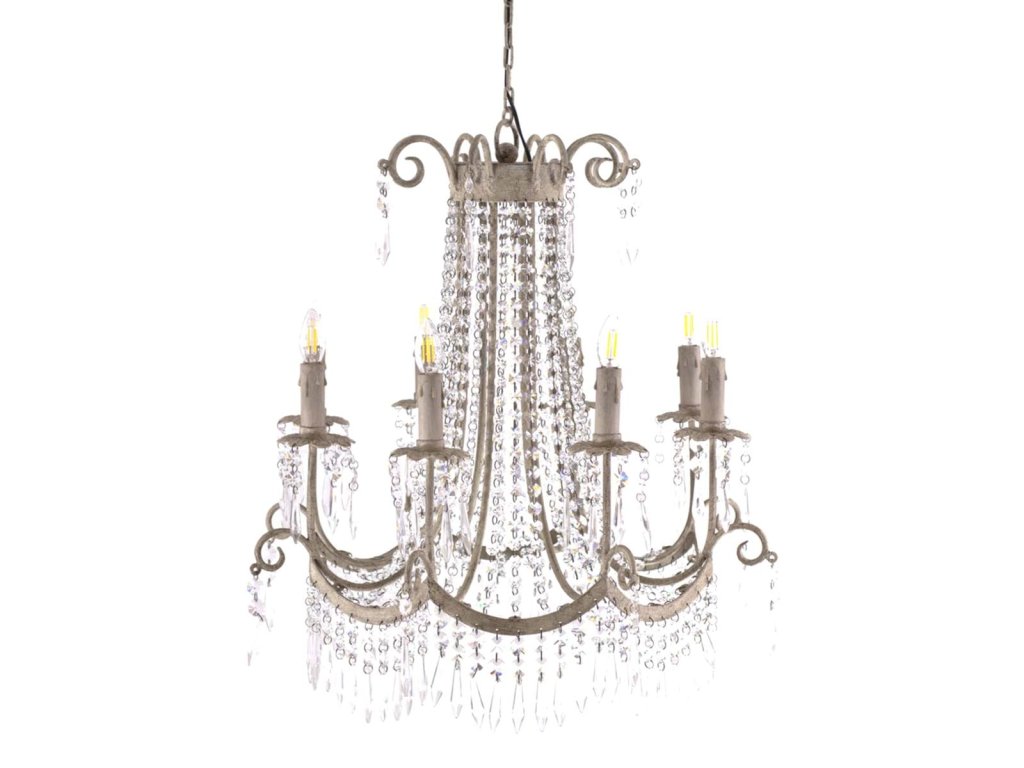Der Kronleuchter ist ideal für ein Wohnzimmer, ein Esszimmer oder ein Schlafzimmer, das im romantischen, provenzalischen oder Shabby-Chic-Stil eingerichtet ist. Dank seines charakteristischen 8-armigen Designs wird er zu einem dominanten Element des Raumes und sorgt gleichzeitig für eine gleichmäßige Beleuchtung des Raumes.