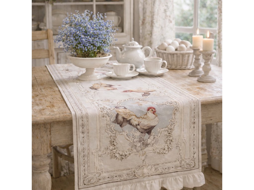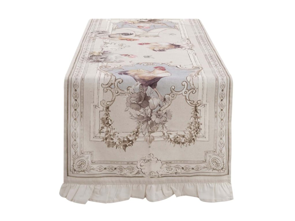 Der Baumwolltischläufer aus der Coco-Kollektion ist eine schöne Ergänzung für ländliche und rustikale Gerichte. Zartes Motivvon Hähnen und Hennen auf weißem Grund in gedämpften Braun-, Blau- und Rottönen schafft eine angenehme, authentische Atmosphäre eines Landhauses.