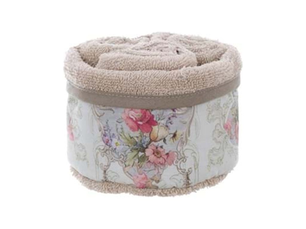 Der dekorative Stoffkorb mit drei kleinen Handtüchern ist eine romantische und praktische Ergänzung für das Badezimmer oder die Küche im Vintage- und Shabby-Chic-Stil. Zartesflorales Motiv aus Rosetten wirkt zart und zeitlos und verleiht dem Raum eine gemütliche Atmosphäre.