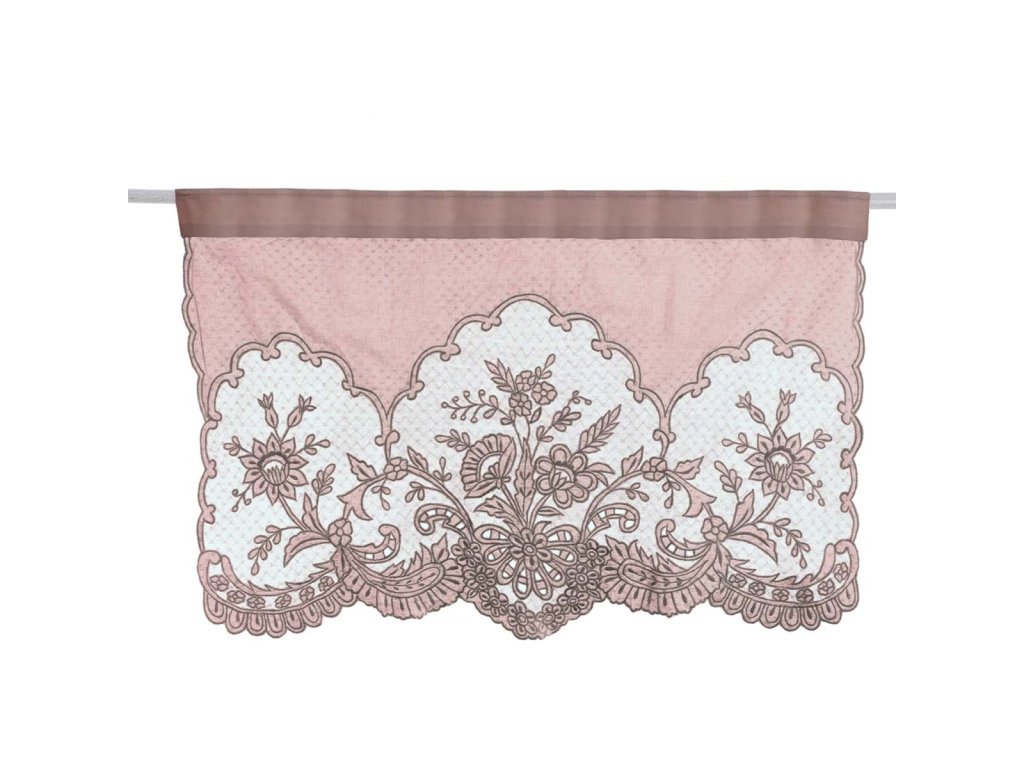 Romantische Kurzgardine (1 Gürtel) mit Tunnel für eine Stange. Mit besticktem Unterteil.