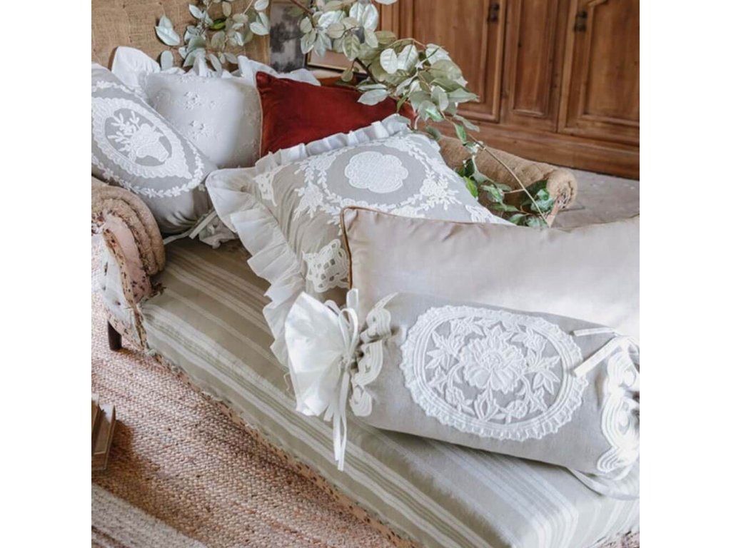 Das elegante bestickte zylinderförmige Kissen aus der Kollektion Sangallo ist ein romantisches Textil-Accessoire im Shabby-Chic- und Landhausstil. Zarte Stickereien, Weiß- und Beigetöne und eine dekorative Rüsche verleihen dem Kissen Leichtigkeit, Zeitlosigkeit und einen angenehmen Vintage-Charakter.
