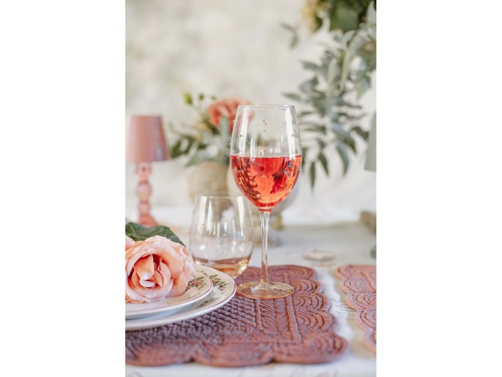 Elegantrosa Weinglas alsomit goldenen Tupfen ist eine unverwechselbare und zugleich subtile Ergänzung für festliche Mahlzeiten. Die Kombination aus zartrosa Farbe und goldenen Details wirkt luxuriös und romantisch und passt perfekt zum Vintage- und Shabby-Chic-Stil.
