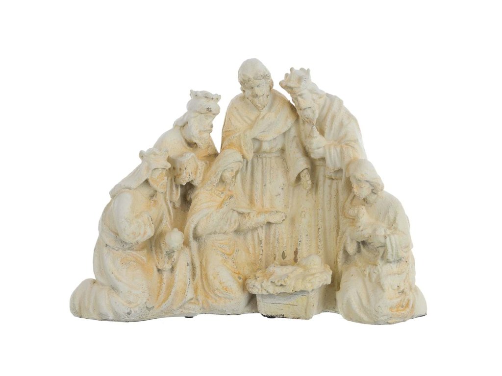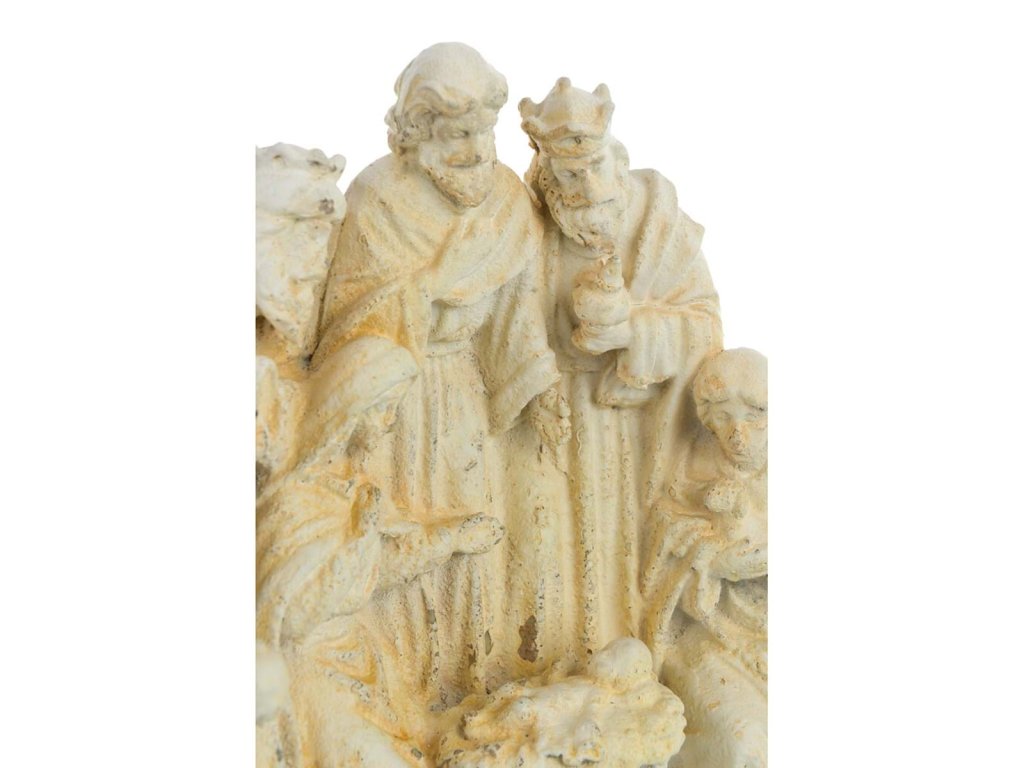Schaffen Sie in Ihrem Zuhause eine Atmosphäre der Demut, Freude und spirituellen Tiefe mit der dekorativen Szene der Anbetung der Heiligen Drei Könige von der italienischen Marke Blanc Mariclo. Diese Polyresin-Skulptur zeigt die drei Weisen, die dem Jesuskind Geschenke bringen, flankiert von Maria und Josef - alles in einer zart patinierten Ausführung mit Vintage-Touch.