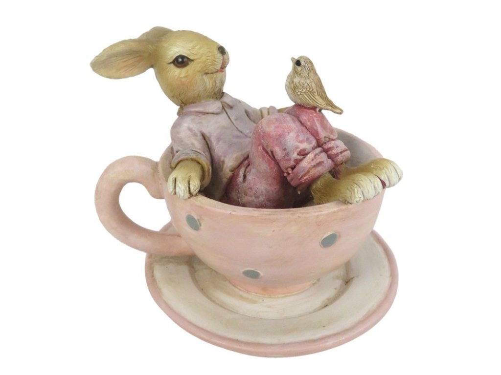 Dekorative Polyresin-Figur eines Häschens mit einem Vogel in einer Tasse.