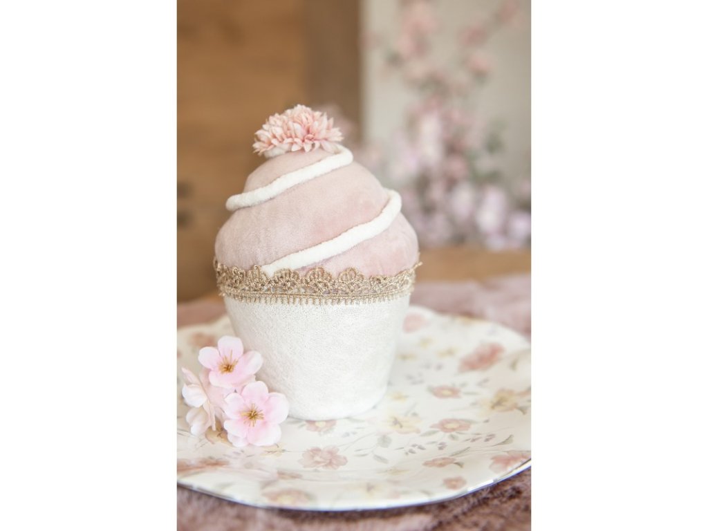 Romantischdekorative Cupcake-Figur in zartem Rosa ist ein originelles Accessoire, das dem Interieur Verspieltheit, einen süßen Touch und eine gemütliche Atmosphäre verleiht. Weichtextildesign in Kombination mit dem Kunststoffsockel wirkt er filigran und dekorativ.