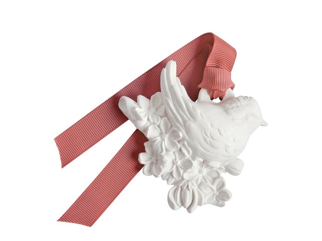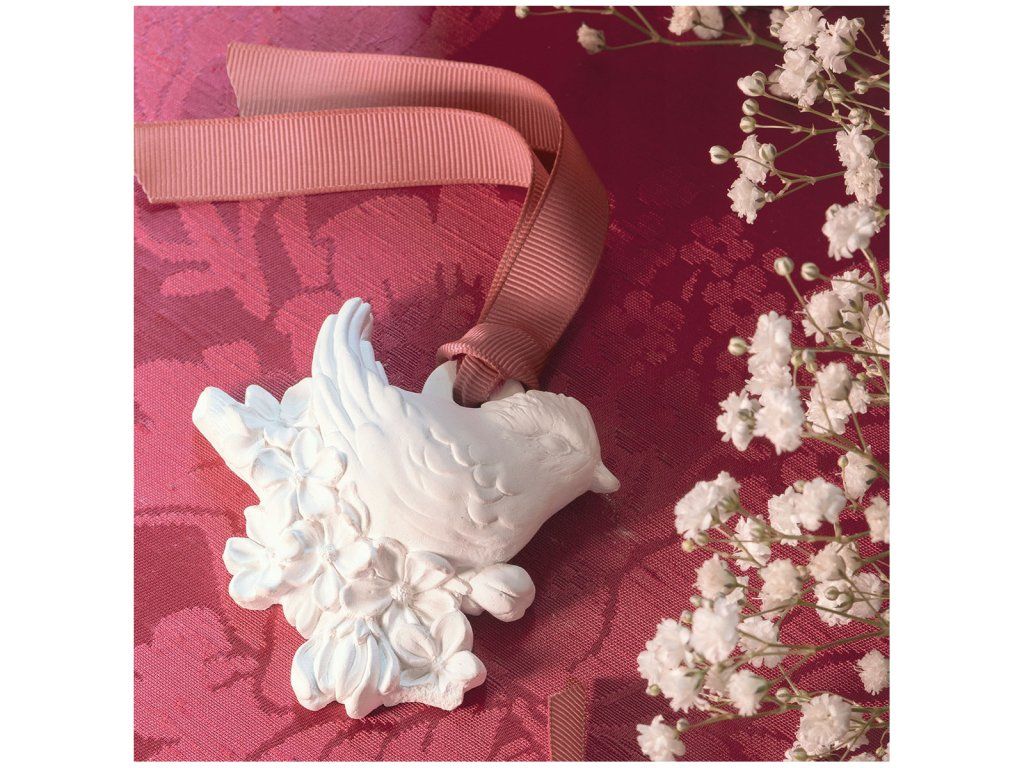 Diese vollständig handgefertigte Gipsdekoration zeigt eine hübsche Meise, die auf einem Bett aus Kirschblüten liegt. Sie wird alle kleinen Räume Ihres Zuhauses, wie Schränke, Schubladen oder Gepäckstücke, für lange Zeit dezent beduften.