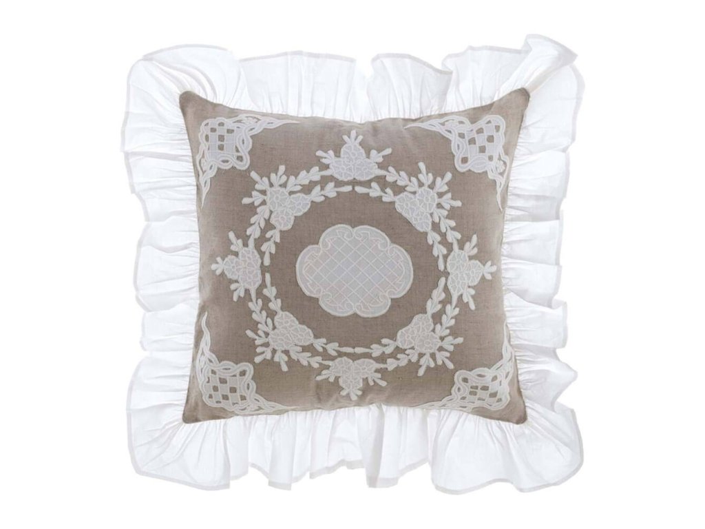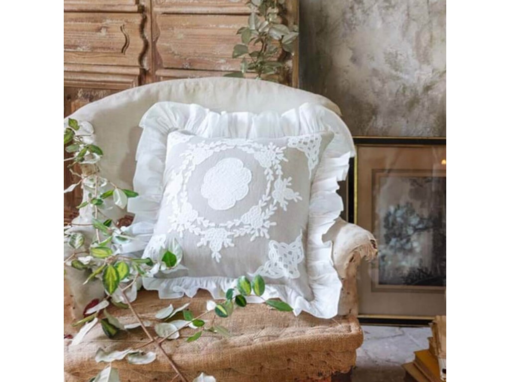 Das elegante, bestickte Kissen aus der Sangallo-Kollektion ist ein stilvolles Textil-Accessoire, das eine subtile Romantik und einen zeitlosen Vintage-Look in Ihr Interieur bringt. Die reiche Stickerei und die natürlichen Materialien passen wunderbar zu Shabby Chic, Landhausstil und provenzalischem Stil.