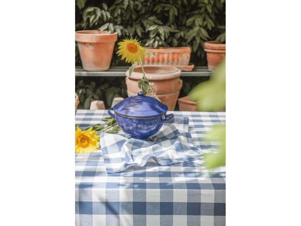 Die blau-weiß karierte Tischdecke von Blanc Mariclò besteht aus einer Mischung aus 70 % Baumwolle und 30 % Synthetikfasern, was ihr ein angenehmes natürliches Aussehen, eine längere Haltbarkeit und eine leichtere Pflege verleiht. Die Größe von 150 × 190 cm ist ideal für die meisten Esstische und verleiht ihnen eine frische, harmonische Atmosphäre. Das zarte blau-weiße Karomuster bringt ländlichen Charme, Eleganz und den für Blanc Mariclò typischen zeitlosen Stil in die Einrichtung. Perfekt für das tägliche Essen und festliche Anlässe.