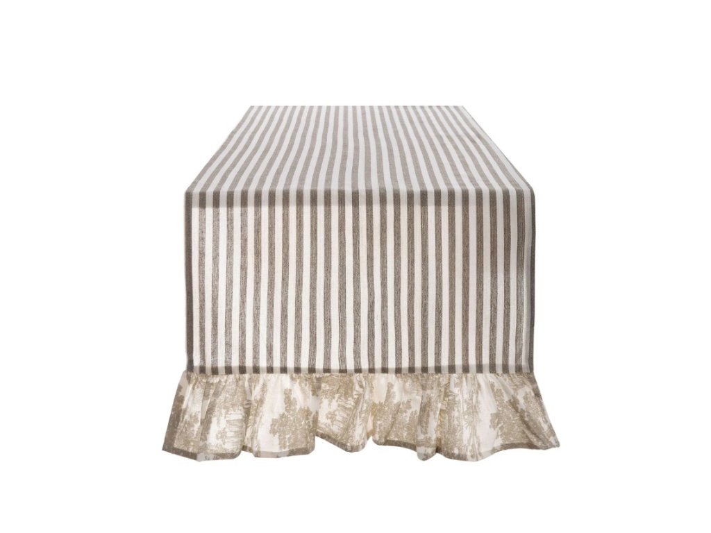 Der elegante Tischläufer mit Zierrüsche ist eine romantische Ergänzung für ein Essen im Vintage- und Landhausstil. MotivToile de Jouy verleiht dem Läufer ein zeitloses Aussehen und eine subtile Eleganz, die sowohl auf dem Ess- als auch auf dem Konferenztisch gut zur Geltung kommt.