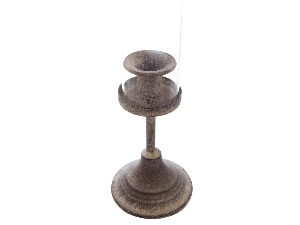 Der hohe und schmale Kerzenhalter aus Metall mit Glas im antiken Vintage-Design ist eine elegante Dekoration für den Innen- und geschützten Außenbereich. Er ist für eine schmale Kerze konzipiert und sieht dank der Kombination aus Metall und Glas zeitlos und subtil dekorativ aus.