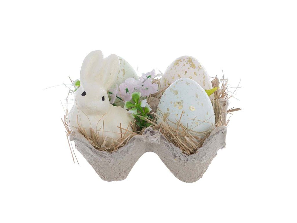 größe: 10 × 10 × 10 cm - Inhalt: 3 Eier und 1 Hase - Material: Polyschaum / Kunststoff / Papier - Stil: Ostern / Romantik - Verwendung: saisonale Dekoration, Frühlingsdekoration - Hersteller: Blanc Mariclò