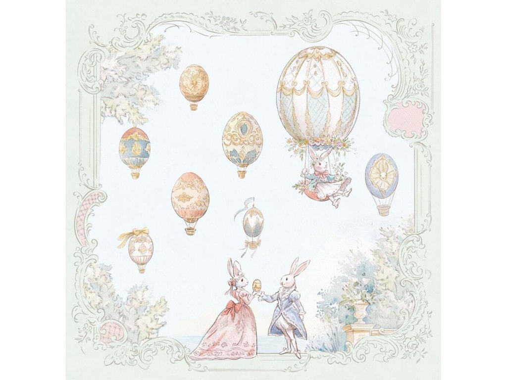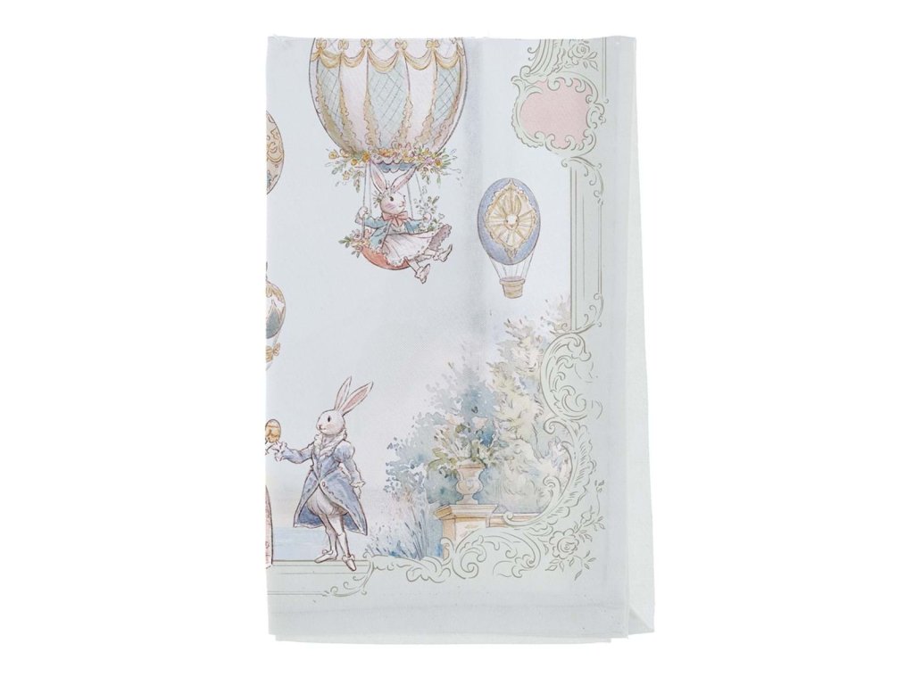 Elegantstoffserviette aus der Rokoko-Kollektion ist eine edle und stilvolle Ergänzung für die festliche Tafel. Romantisches Motivkaninchen und Ornamente in pastellfarbenen Rosa- und Blautönen auf weißem Hintergrund wirkt festlich, zart und ergänzt perfekt die Ostertafel.
