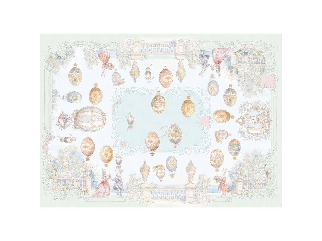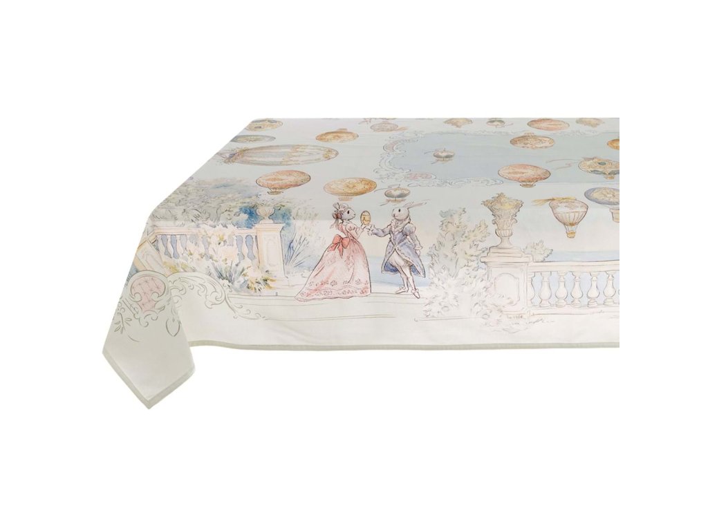 größe: 160 × 220 cm - Material: 100% Baumwolle - Kollektion: Rokoko - Motiv: Hasen, Ornamente - Farbe: weißer Hintergrund, Pastellrosa und Blau - Stil: Ostern / Romantik / Vintage - Verwendung: Tischdecke