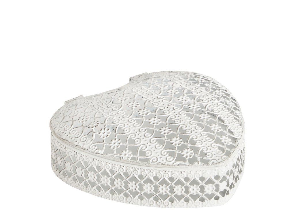 Mit diesem zarten Schmuckkästchen in Herzform kommt Romantik in Ihre Einrichtung. Die elegante, offene Verzierung mit floralen Arabesken verleiht dem Kästchen den Charme eines kostbaren Objekts. Die verblasste Metalloberfläche sorgt für Weichheit und Glanz und macht das Schmuckstück zart und zeitlos.
