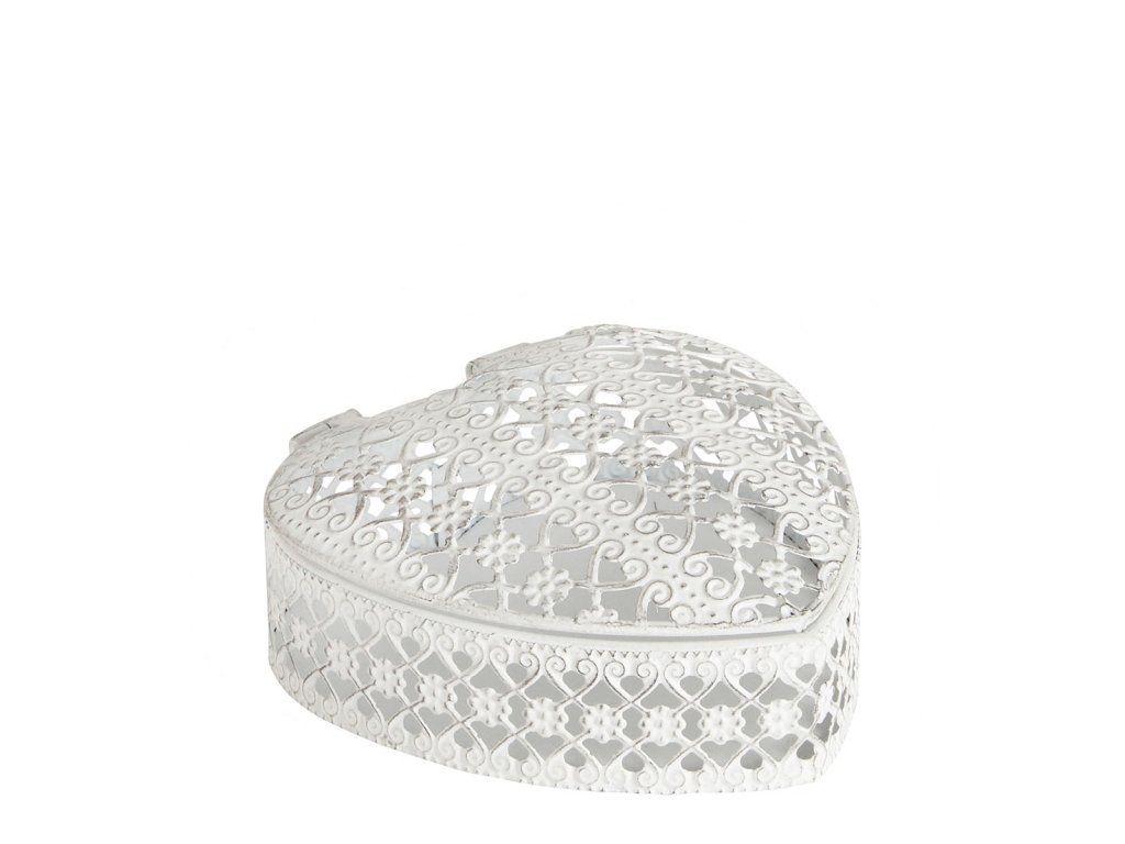 Mit diesem zarten Schmuckkästchen in Herzform kommt Romantik in Ihre Einrichtung. Die elegante, offene Verzierung mit floralen Arabesken verleiht dem Kästchen den Charme eines kostbaren Objekts. Die verblasste Metalloberfläche sorgt für Weichheit und Glanz und macht das Schmuckstück zart und zeitlos.