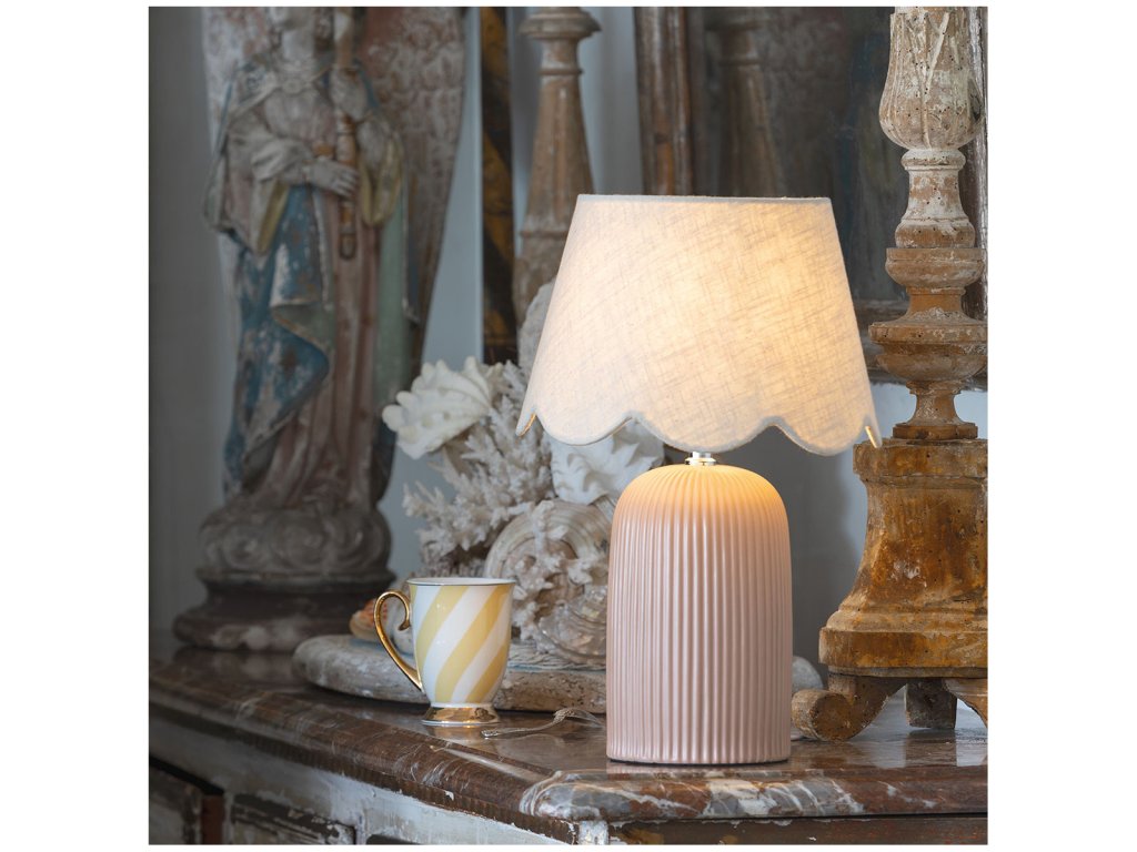 Verlieben Sie sich in die Eleganz der Sibylle Lampe aus Keramik. Die komplett handgefertigte Lampe vereint Zartheit und Poesie. Ein schöner Leinenschirm mit einem sanft gewellten Rand vervollständigt dieses dekorative Stück.