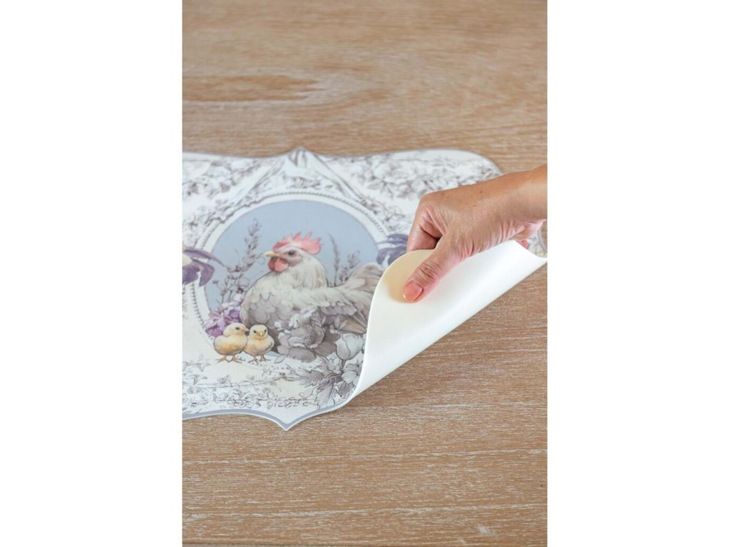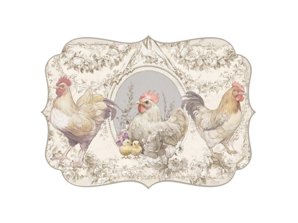größe: 31 × 45 cm - Material: Vinyl - Kollektion: coco - Motiv: Hähne und Hühner - Farbe: weißer Grundton, braun / blau / rote Farbtöne - Stil: rustikal / vintage - Verwendung: Tischläufer