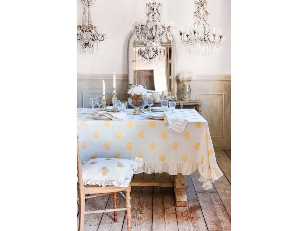Romantischtischtuch aus Baumwolle mit Rüsche (Gala 4 cm) von der italienischen MarkeBlanc Mariclo aus der SammlungCuori-Elite ist ein stilvolles Accessoire für ein festliches Essen. Vbeige mit goldenen Herzen bedruckt sieht zart und elegant aus und bringt einen Hauch von Liebe und Raffinesse auf Ihren Tisch.