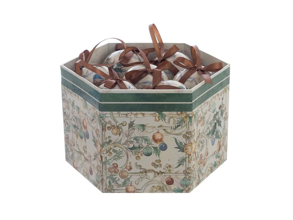 Elegantgeschenkbox mit 14 Weihnachtsdekorationen von der italienischen MarkeWeißer Maricló aus der SammlungIntrecci di Sogno ist ein ideales Accessoire für die festliche Raumgestaltung oder als stilvolles Geschenk. Kugeln mit Durchmesser7,5 cm sind hergestellt ausleicht glänzender Kunststoff und mit Motiven verziertverzierungen, Ornamente und Bänder im romantischen Vintage-Stil. Box incremefarben mit brauner Schleife sieht feierlich und elegant aus. Dieseoriginalprodukt aus einer toskanischen Werkstatt ist mit viel Liebe zum Detail, Ästhetik und italienischem Charme gestaltet.
