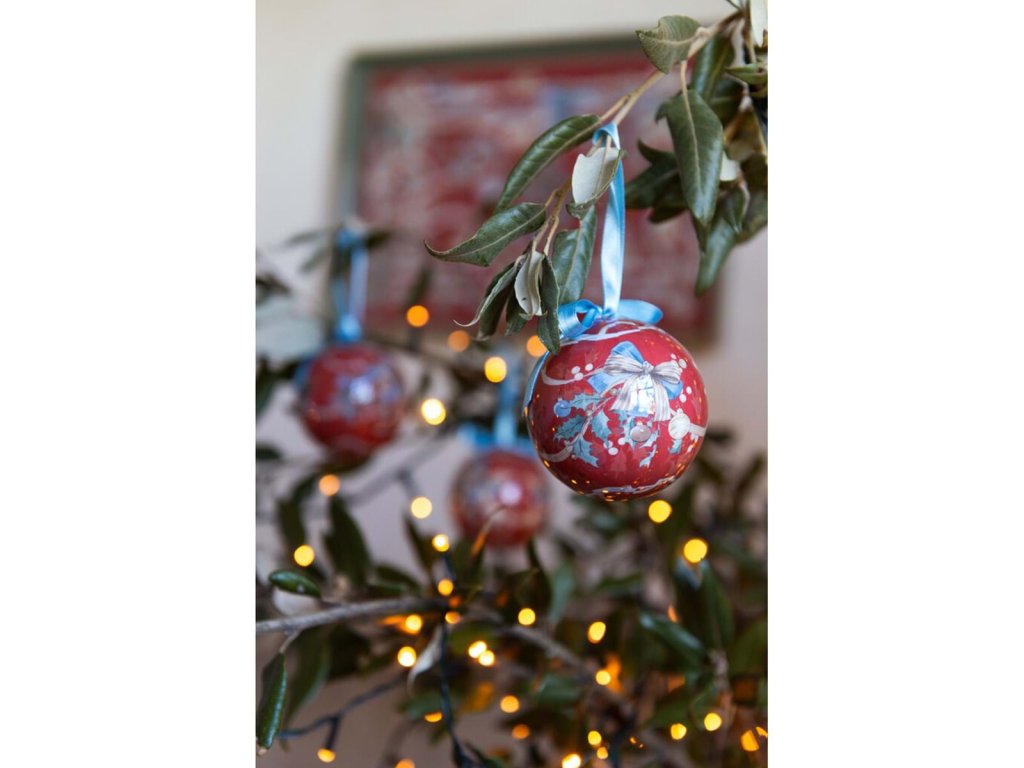 ✅5er-Set - ideal für Baum, Kränze oder Gestecke ✅ Romantisches Motiv - Ornamente, Dekorationen und Schleifen ✅ Farben: roter Ball mit blauer Schleife ✅ Sammlung Intrecci di Sogno - Blanc Maricló ✅ Echtes Produkt aus der Toskana - hochwertige Verarbeitung