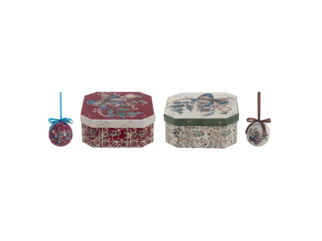 Abmessungen der Schachtel:19,5 × 19,5 × 8,2 cm Größe der Dekorationen:Ø 7,5 cm Material:glänzender Kunststoff