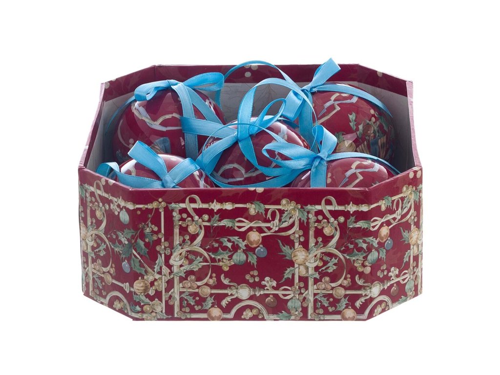 Geschenkpackung mit 5 Kugeln Blanc Maricló - Ø 7,5 cm, rot mit blauer Schleife, Kollektion Intrecci di Sogno