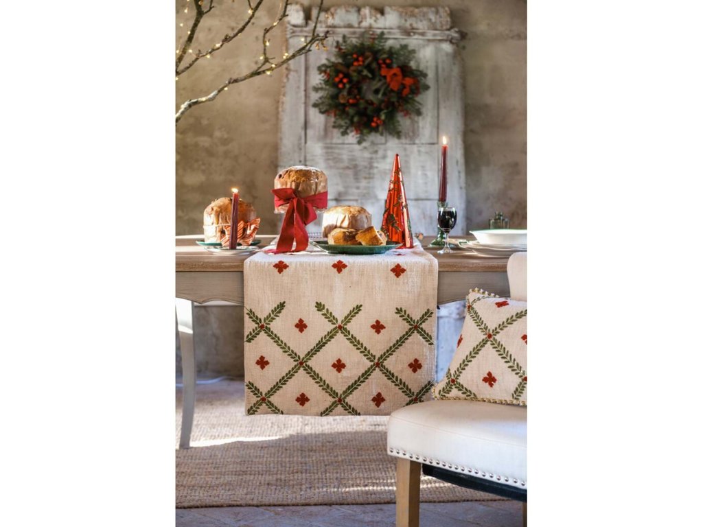 Elegantweihnachts-Baumwoll-Kissen der MarkeWeißer Maricló aus der Toskana. Hergestellt aus;100% Baumwolle. Beige Basis dekoriert mitstickerei mit Mustern und kantig - perfekt für festliche Innenraumgestaltung.