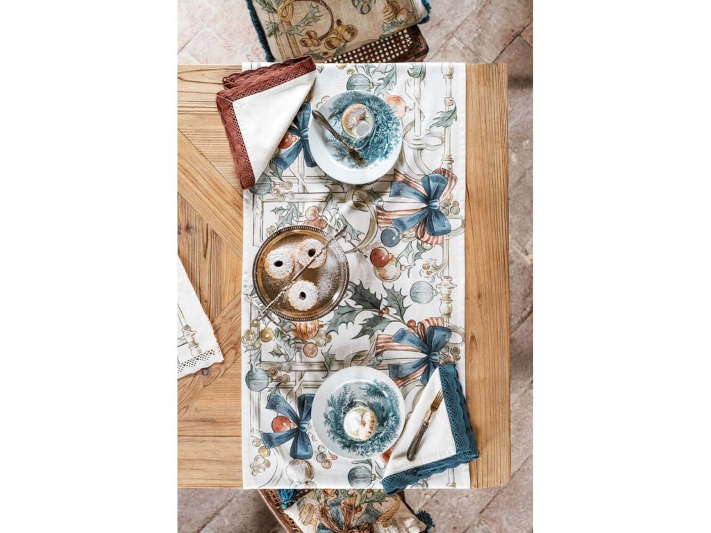 ✅ Tischläufer mit Spitze - elegantes und praktisches Accessoire ✅ Motiv aus Ornamenten, Verzierungen und Schleifen - romantisches Design ✅ Farben: grün-braun und blau auf cremefarbenem Hintergrund ✅ Kollektion Intrecci di Sogno - Blanc Maricló ✅ Originalprodukt aus der Toskana - handgefertigt