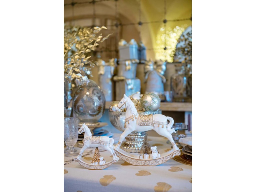 Fabelhaftweihnachten Schaukelpferd Dekoration von der italienischen MarkeBlanc Mariclo aus der SammlungDora ist von hoher Qualitätpolyresin. IN weiß mit goldenen Details sieht elegant und nostalgisch aus - ideal für Festtagsarrangements, zur Dekoration eines Kamins, Regals oder Kinderzimmers.