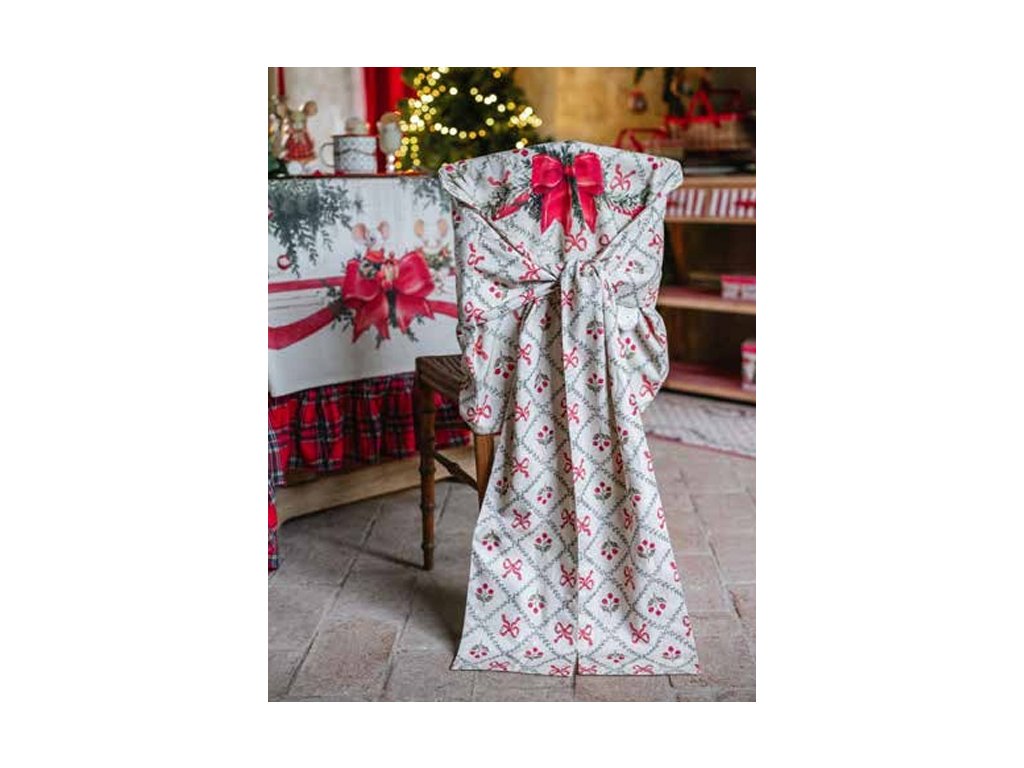 Originalweihnachten Stuhlrückenbezug von der italienischen MarkeWeißer Maricló aus der SammlungFamilie Noel ist ein stilvolles Accessoire für ein festliches Interior Tuning. Hergestellt aus100% Baumwolle, verziert mit einem bezauberndenmotiv der gemalten Weihnachtsmäuse in traditionellen Farben -grün, rot und weiß. Die Abdeckung ist einfachbindet eine Schleife aufund verleihen dem Stuhl ein dekoratives und gemütliches Aussehen.