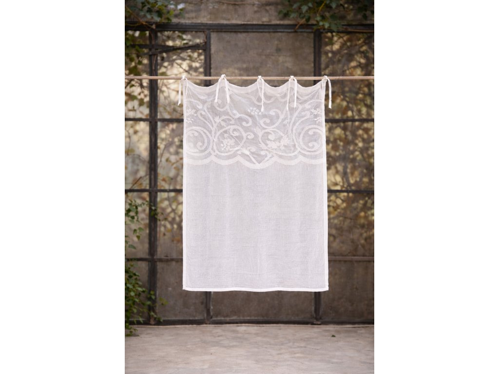 Elegantkurzer Vorhang aus der Kollektion Soffio vweiße Farbe verbindet die Sanftheit natürlicher Materialien mit romantischem italienischem Design.Der obere Teil ist reichlich mit gestickten Ornamenten verziert, währendder untere Teil ist einfach und halbtransparentdadurch ist der Vorhang sehr lichtdurchlässig und schafft eine luftige, helle Atmosphäre.